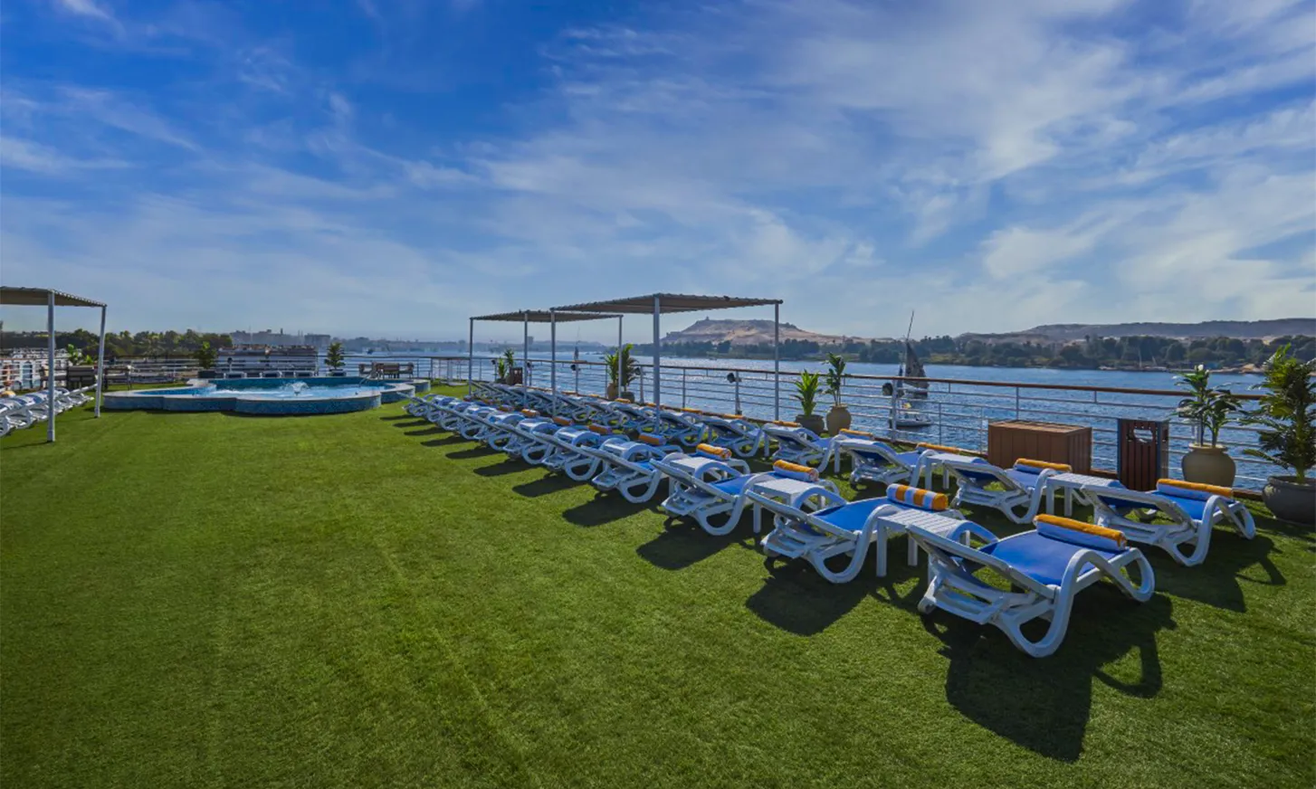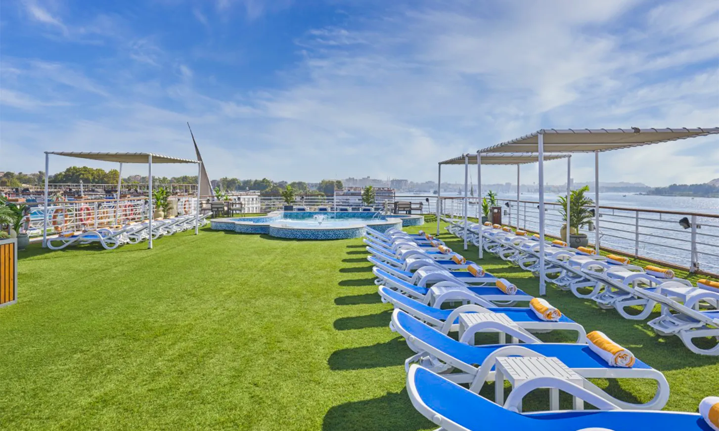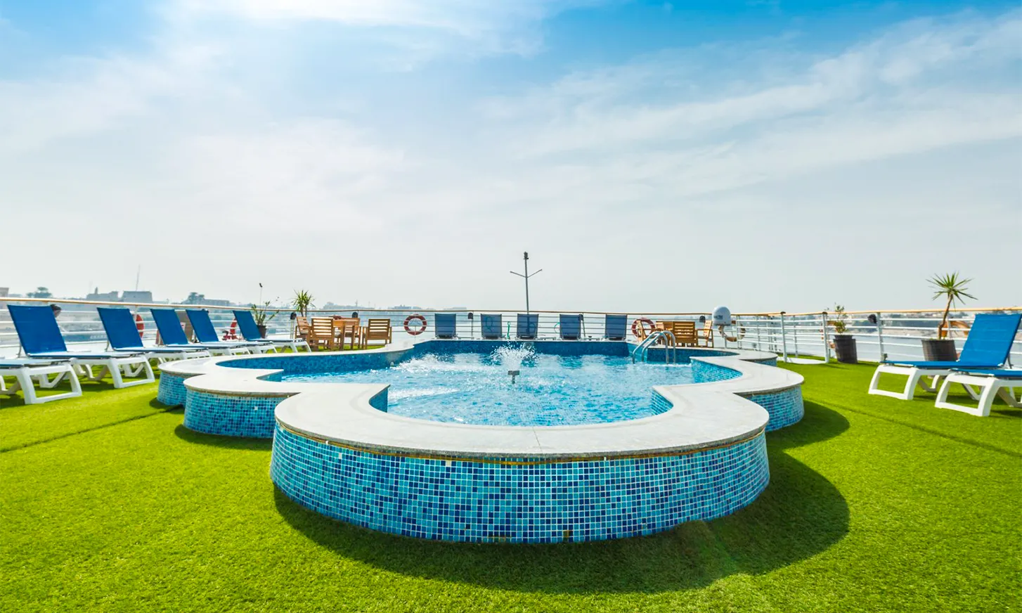 From the moment you enter, Blue Shadow I welcomes you with its contemporary design and warm hospitality. The spacious Sun Deck is perfect for soaking in breathtaking Nile views, featuring a swimming pool, shaded lounge areas, and a bar serving refreshing drinks. The ship's restaurant and lounge provide a delightful culinary experience with a mix of international and Egyptian flavors.
