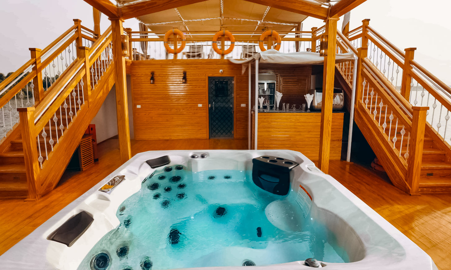 • Cabins: Elegant en-suite cabins feature panoramic windows, hand-carved wood accents, air-conditioning, and fine linens.