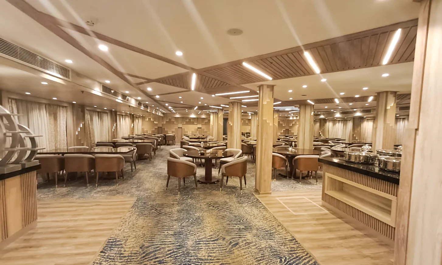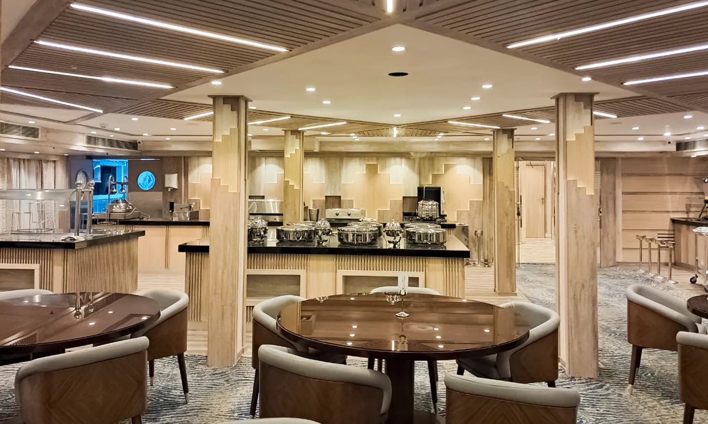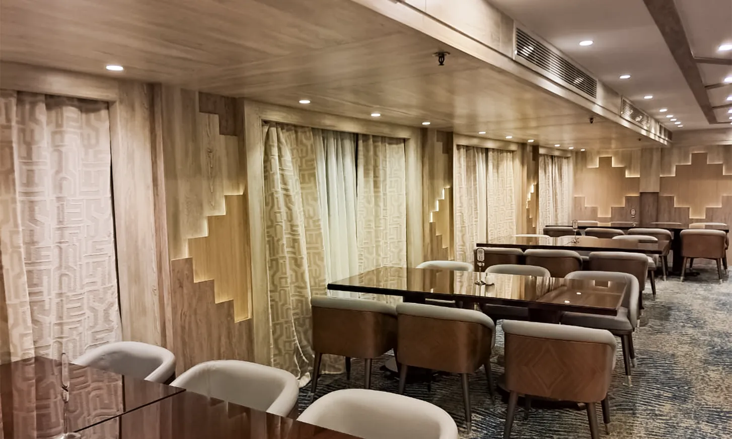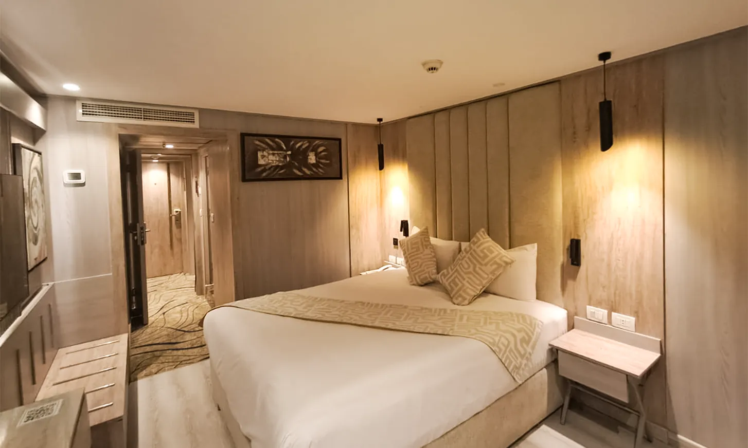 Each spacious and elegantly designed cabin includes large panoramic windows, comfortable bedding, a private bathroom with a bathtub, LCD TV, mini-bar, and air conditioning, ensuring a peaceful and rejuvenating stay.