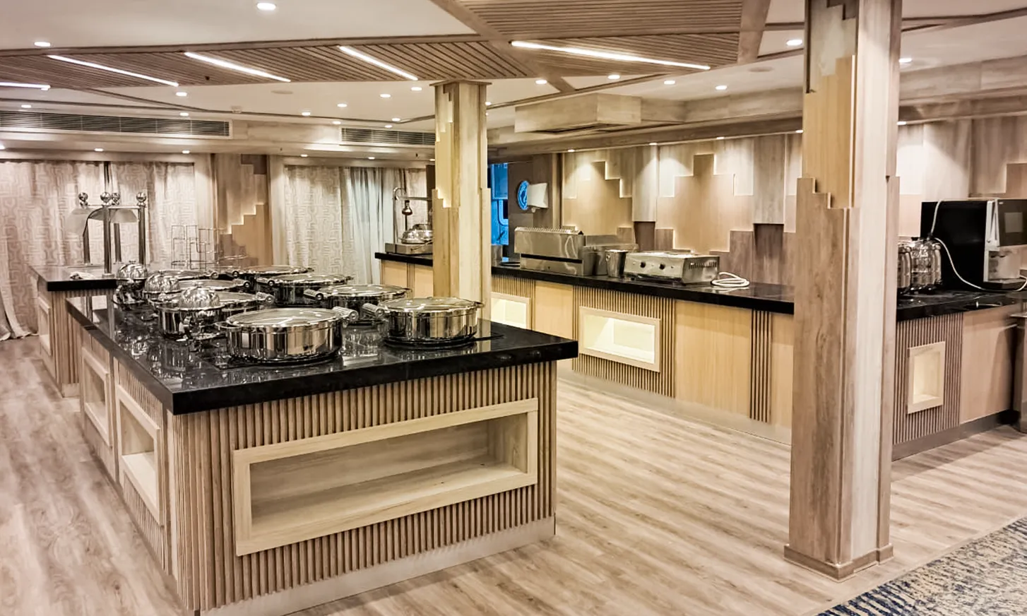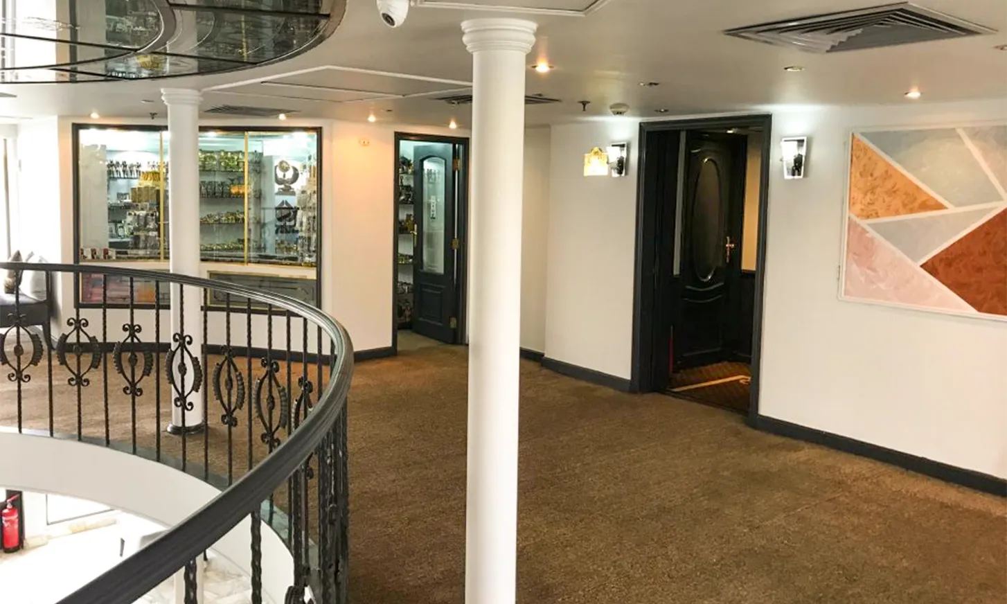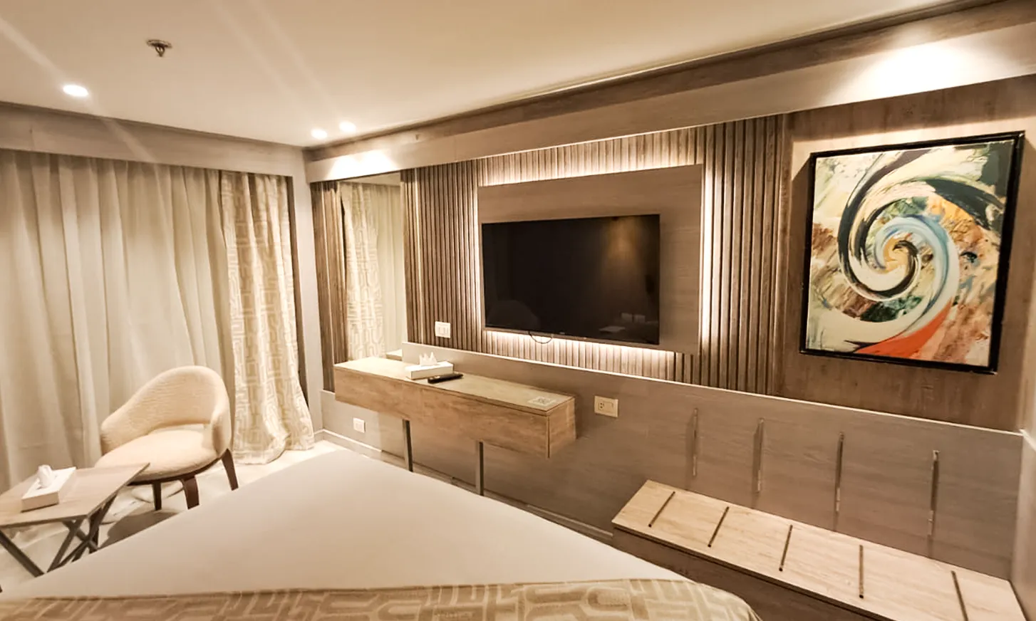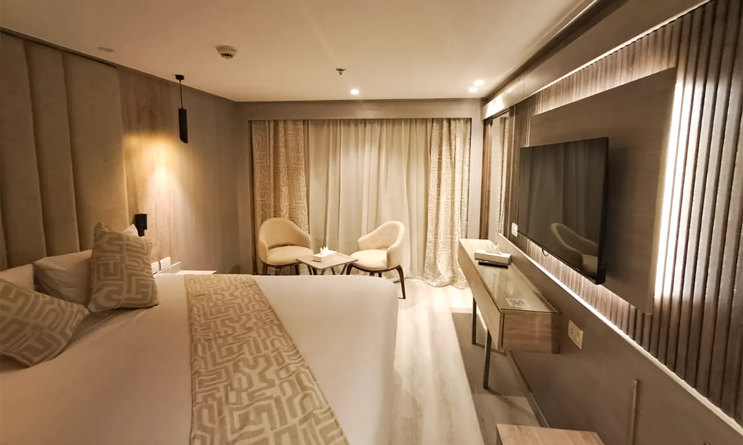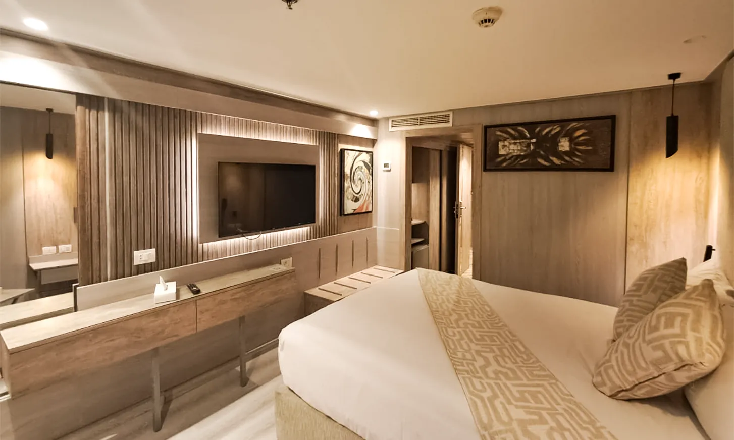 Each spacious and elegantly designed cabin includes large panoramic windows, comfortable bedding, a private bathroom with a bathtub, LCD TV, mini-bar, and air conditioning, ensuring a peaceful and rejuvenating stay.