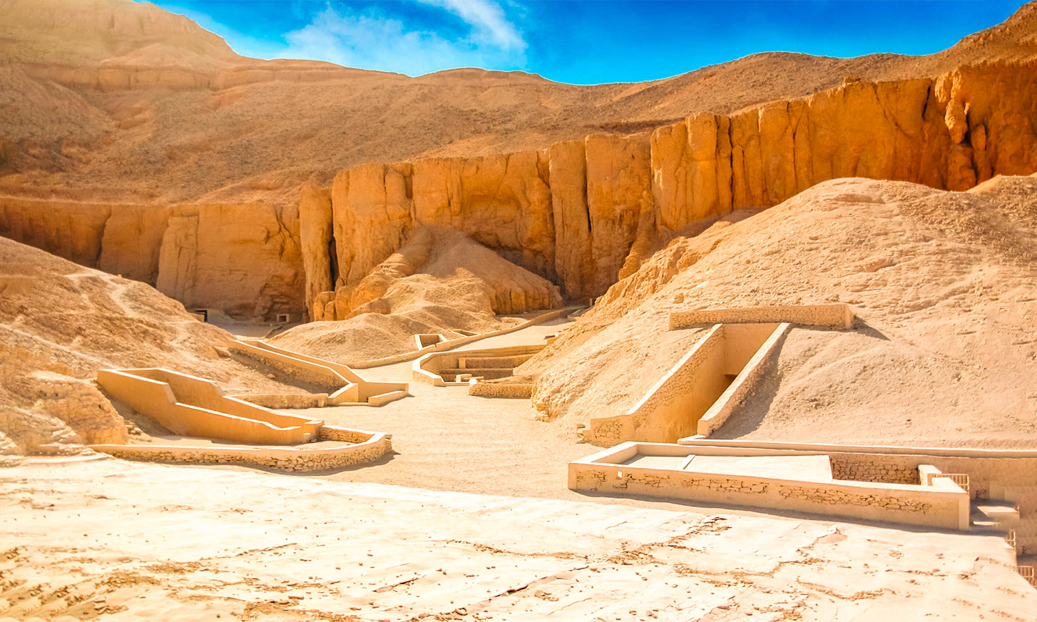 Crossing the Nile to the West Bank, the atmosphere shifts. Here lies the Valley of the Kings, where the tombs of pharaohs like Tutankhamun rest deep within the hills, their walls covered in vibrant scenes of the afterlife. Nearby, the majestic Temple of Hatshepsut, built into the cliffs of Deir el-Bahari, stands as a bold and graceful tribute to Egypt’s most powerful female ruler.