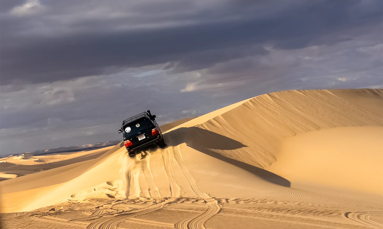The adventure then expands into the Great Sand Sea, where sweeping dunes and remote desert springs create a dramatic and unforgettable landscape. From swimming in Bir Wahed to sandboarding across golden dunes and enjoying sunset dinner in a desert camp, the safari day combines thrill and tranquility.