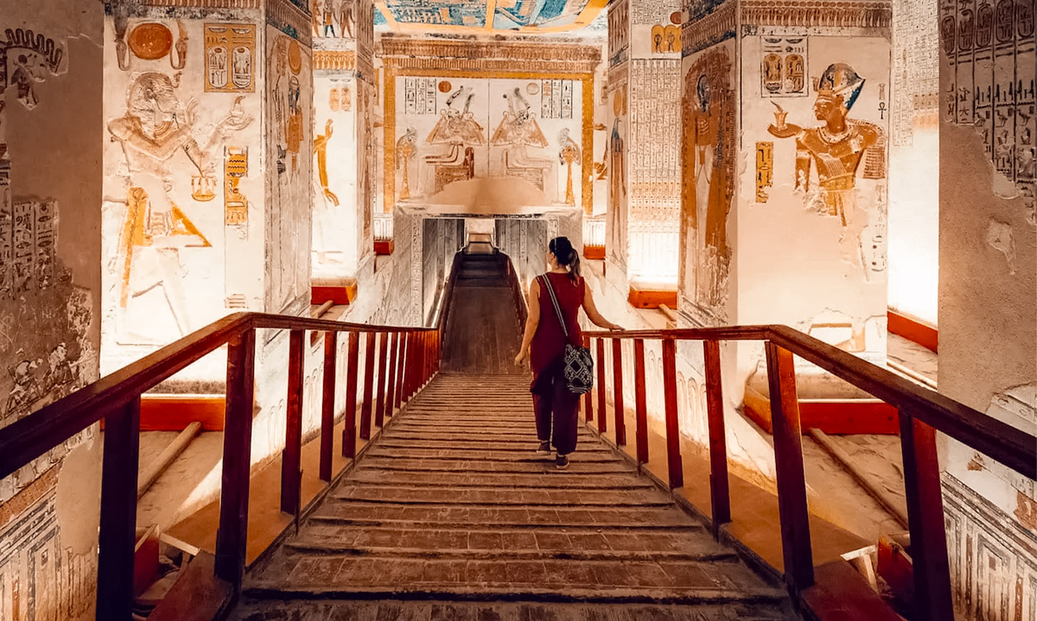 Valley of the Kings: Explore the royal tombs hidden in the Theban hills, including the famous tombs of pharaohs from the New Kingdom, adorned with vibrant murals and hieroglyphics. Optional visit to Tutankhamun's tomb.